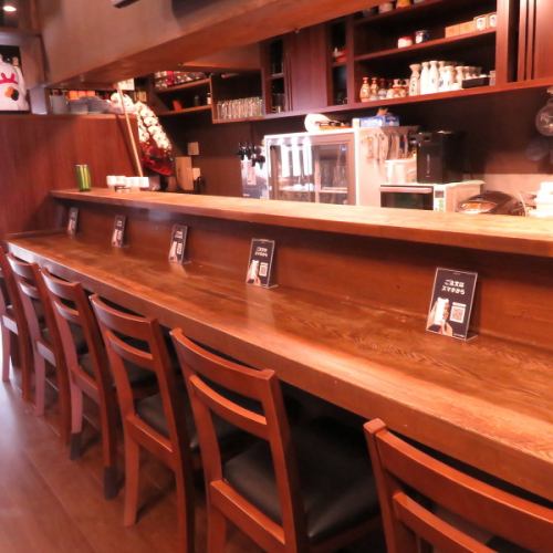 お一人様でも気兼ねなくお過ごしいただけるカウンター席を全6席ご用意◎お仕事帰りのサク飲みや、一人でじっくり料理とお酒を味わいたい時にぴったりです♪茶色ベースの落ち着いた空間に、暖色のライトが灯る居心地の良い雰囲気!目の前で調理の様子を眺めながら、臨場感と共に自慢の料理をお楽しみください。